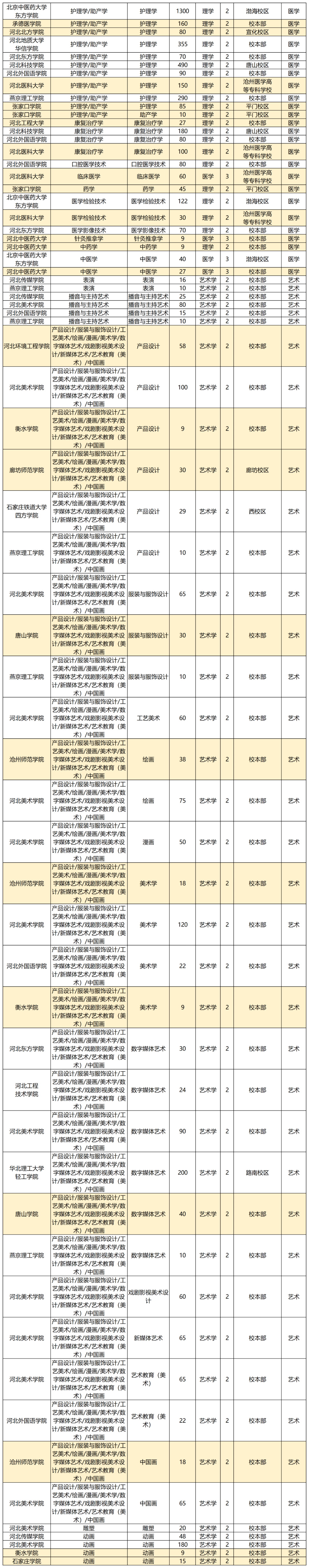 【石家庄】河北医科大学、河北师范大学、石家庄铁道大学、河北科技大学、河北经贸大学、河北地质大学、河北中医药大学、石家庄学院、河北工业职业技术大学、河北体育学院【保定】河北农业大学、保定学院、河北金融学院【沧州】河北水利电力学院、沧州师范学院【承德】承德医学院、河北民族师范学院、河北石油职业技术大学【邯郸】河北工程大学、邯郸学院【衡水】衡水学院【廊坊】北华航天工业学院、廊坊师范学院【秦皇岛】河北科技师范学院、河北环境工程学院【唐山】华北理工大学、唐山师范学院、唐山学院【邢台】邢台学院、河北科技工程职业技术大学【张家口】河北建筑工程学院、张家口学院、河北北方学院民办院校